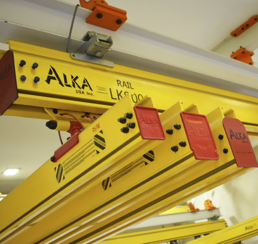 The ALKA RAIL SYSTEM is ideal for moving loads to and from a fixed or moving position with the help of a vertical lifting device (dipper, dipper, load assistant), they are generally used for ergonomic reasons to help workers to perform tasks to reduce the risk of injury. The Alka rail system can handle loads of up to 2,200 lb (1000 kg) using the “Enclosed Track” configuration consisting of a rectangular tube-like section with a continuous groove along the bottom of the the section where cars travel internally.